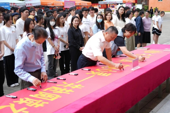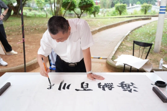 曾德锦书记现场泼墨挥毫,写下“海纳百川”,字体遒劲有力。学生代表宣读《读书倡议书》。在朱若凡老师的指导下,由30名同学组成的诵读团,进行经典诵读,将现场气氛推向高潮。校领导及师生代表们纷纷在读书月主题条幅上签名。