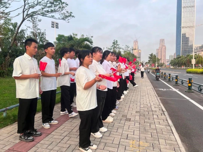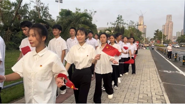 海南工商职业学院70名学子作为海南省高校学生代表参加仪式。上午8时,升旗仪式正式开始。国旗护卫队迈着整齐划一、铿锵有力的步伐,护送着五星红旗正步走向旗杆。在激昂的国歌声中,五星红旗冉冉升起,在熠熠晨光中迎风飘扬。同学们庄重肃立,行注目礼,齐声高唱国歌。
