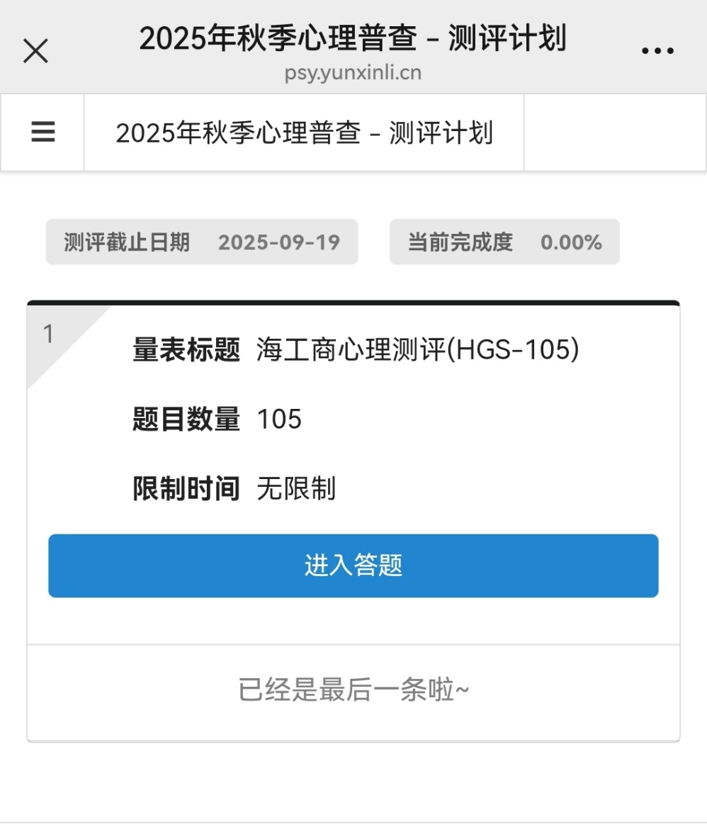 (二)在规定日期内,作答不限时长,但需一次做完。所有参评学生需完成测评量表中的全部105道题目,不能中途退出,否则将影响测评结果。