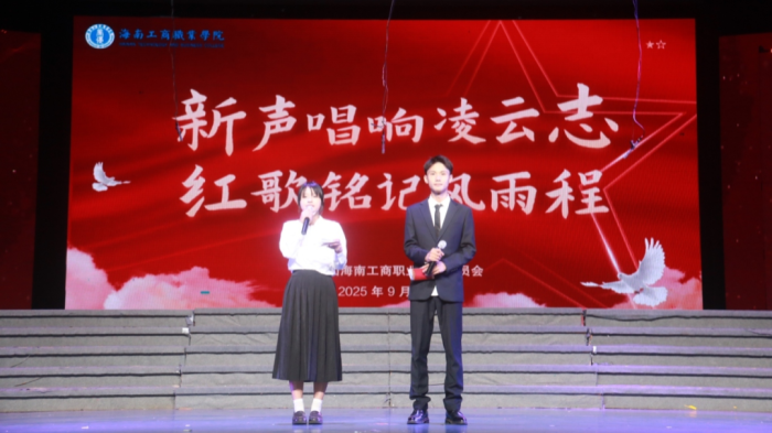 2025年9月19日晚,“新声唱响凌云志 红歌铭记风雨程”——海南工商职业学院2025级新生红歌合唱比赛在学校大礼堂圆满落幕。活动特邀校团委倪小凤老师、继续教育学院王丹媛老师和教官曹立正同志担任评委。